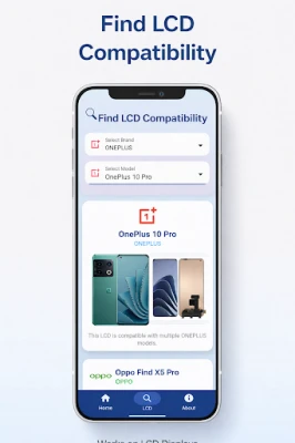 LCD COMPATIBLE هو الأداة المثالية لفنيي الهواتف ومراكز الصيانة. يسهل عليك العثور على توافق قطع الغيار مثل شاشات LCD، الشرائح، الكابلات المرنة، والبطاريات لآلاف طرازات الهواتف من Samsung، Xiaomi، وغيرها. يوفر دقة عالية وواجهة ذكية للتصفح السريع.
