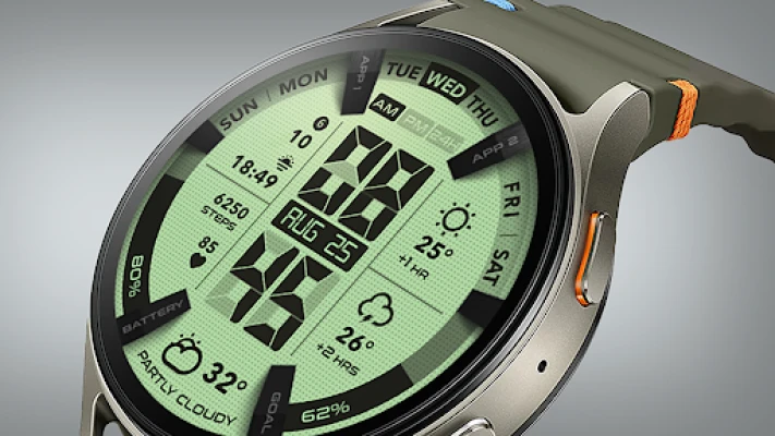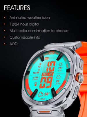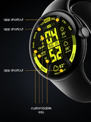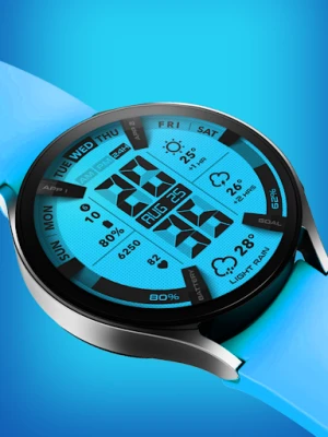 لمسة حيوية من الأناقة والذكاء تنتظرك. استمتع بتوقعات الطقس المتحركة التي تبقيك على اطلاع دائم، بالإضافة إلى لمحات سريعة عن الساعتين القادمتين. لا تفوت أبدًا تتبع تقدمك اليومي بفضل مقياس الأهداف للخطوات، وراقب مستوى شحن بطارية ساعتك بكل سهولة. يتيح لك هذا الوجه تعديل أنماط الألوان لتناسب مزاجك أو ملابسك، بالإضافة إلى تخصيص عناصر المعلومات (complications) لعرض البيانات الأكثر أهمية بالنسبة لك، مما يضمن أن ساعتك تعمل كمركز معلومات شخصي فائق الكفاءة.