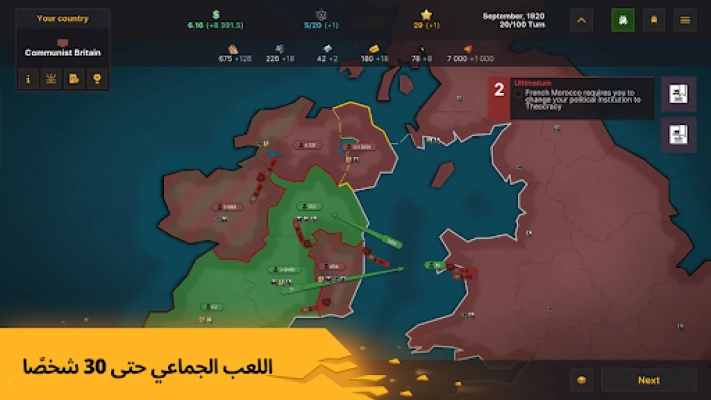 عندما تفشل الدبلوماسية، استعد لإطلاق العنان لقوتك العسكرية المدمرة. قد جيشاً متنوعاً من المشاة المتأهبة، الأساطيل البحرية المهيبة التي تضم الطرادات وحاملات الطائرات، وصولاً إلى القوة المروعة للأسلحة النووية والكيميائية. حصّن أراضيك بالتحصينات المتقدمة والبنى التحتية الدفاعية الأخرى. لكن القوة الحقيقية لا تكمن فقط في الدمار؛ بل في التطور أيضاً. تقدم عبر شجرة تقنيات واسعة لاكتشاف مجموعة متنوعة من المباني والهياكل الجديدة. اختر واحداً من ستة أنظمة سياسية متميزة، يتخذ كل منها قرارات قد تغير مسار التاريخ. تحكم في كل مقاطعة داخل بلدك بشكل مستقل لضمان تحقيق اختراقات اقتصادية وعلمية، مؤكداً بذلك ازدهار أمتك وهيمنتها على الساحة العالمية.